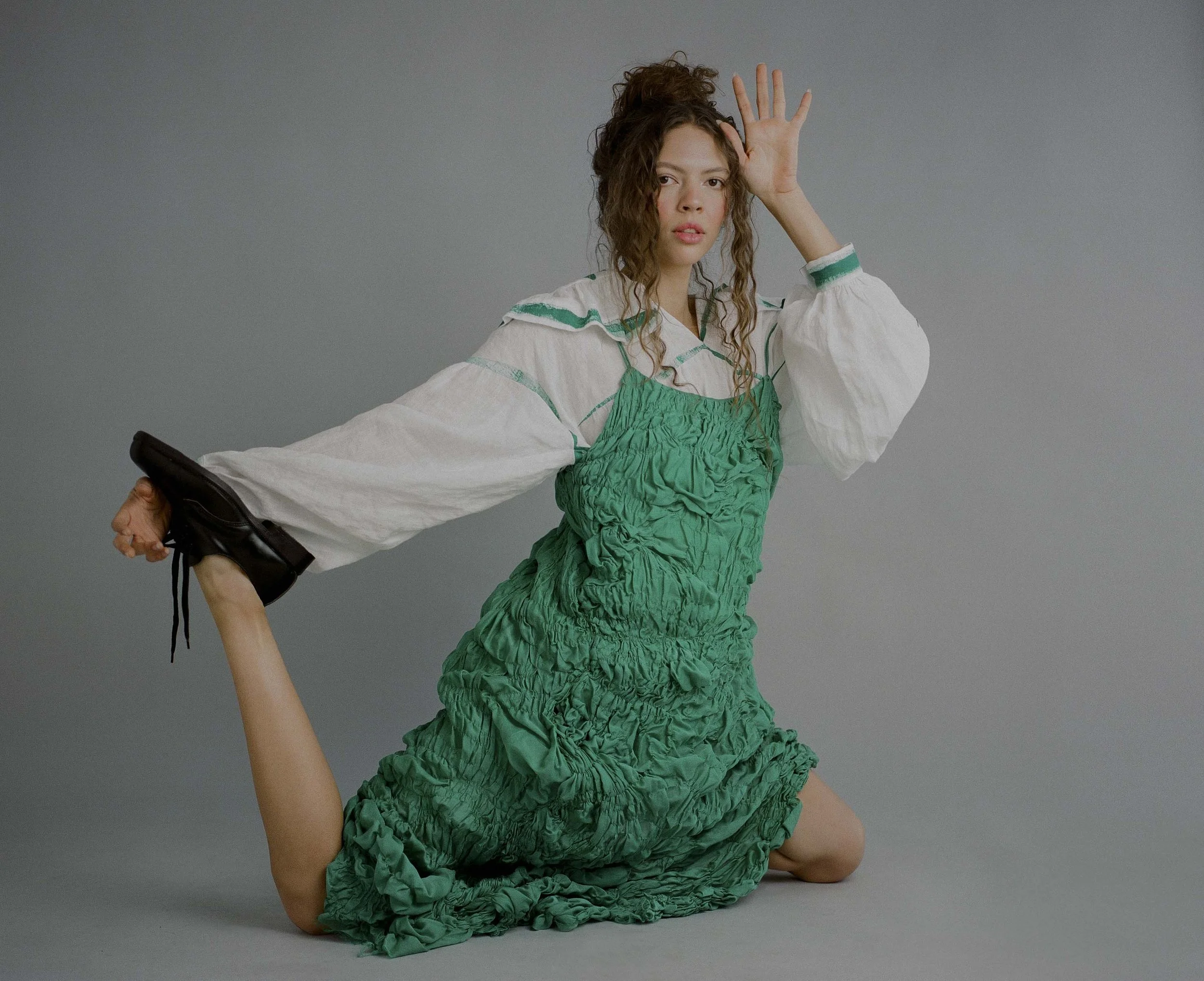 Clea wearing a custom shirred look of bloomers, legwarmers, sleeves and Handkerchief Top. Photograph by James Caswell
